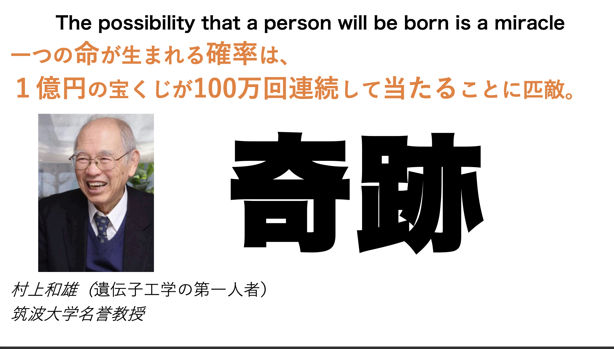 まず、私たち一人ひとりが「この世に生まれる」こと自体が奇跡です。筑波大学名誉教授の村上和雄先生は、この確率を「1億円の宝くじが100万回連続で当たるほどの確率」と表現しています。精子と卵子の無数の可能性の中から、たった一人としてこの世に存在することができた――それだけで、私たちは奇跡の連続の中にいるのです。
