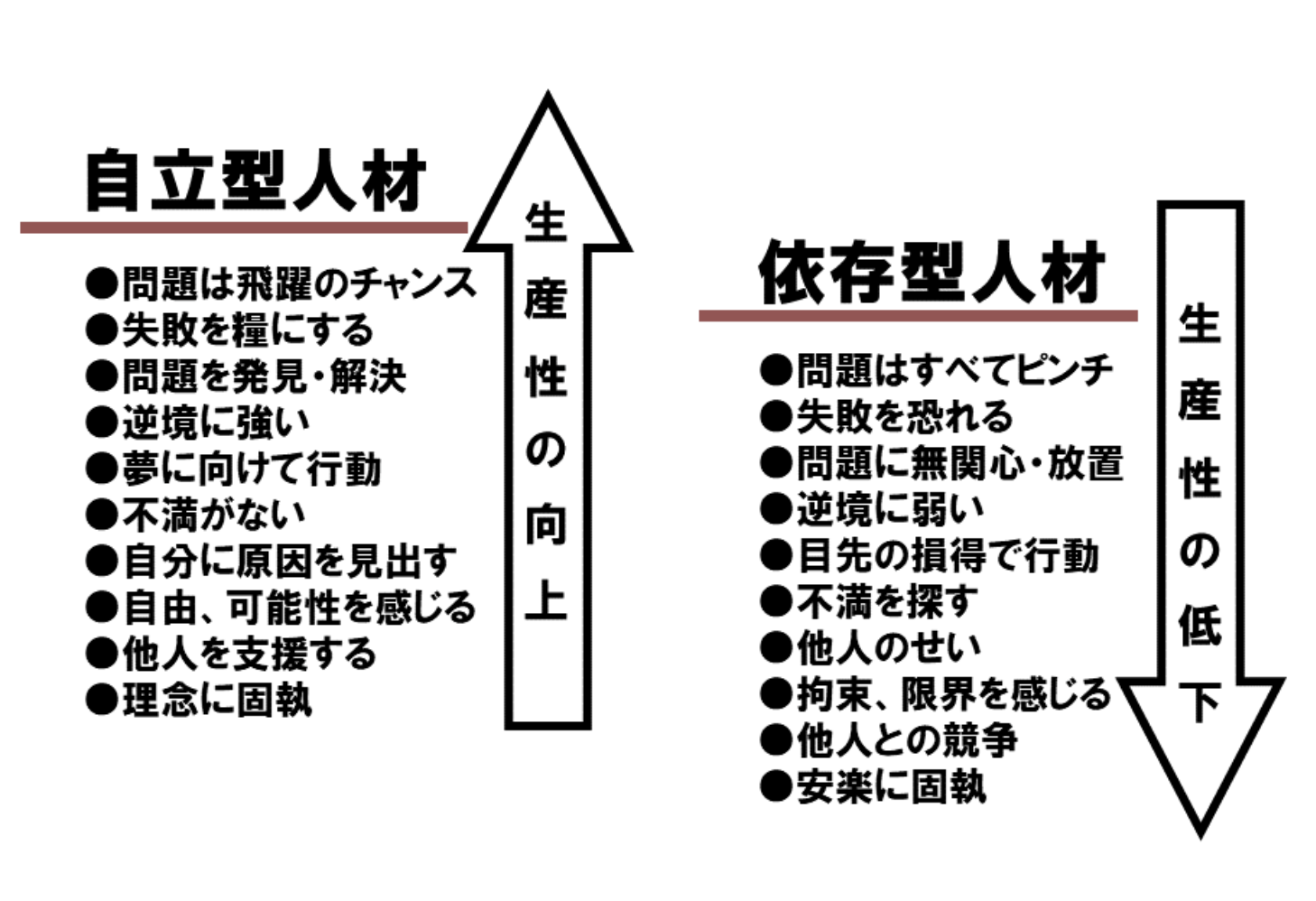 講座の中では、人には「自立型」と「依存型」という2つの傾向があると説明されます。自立型の人は、問題を飛躍のチャンスと捉え、失敗を学びに変え、逆境にも強い。常に自分に原因を探し、理想に向かって主体的に行動します。自由や可能性を感じ、仲間を支えながら前に進む姿が特徴です。一方、依存型の人は、問題をすべてピンチと感じ、失敗を恐れ、逆境に弱い傾向があります。不満を探し、他人のせいにし、制限や競争を理由に動けなくなる。そして最終的には“安楽”に固執し、現状維持を選んでしまうのです。
