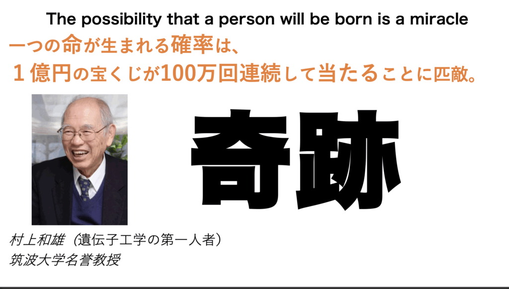「一期一会」と言いますが、人との縁、そしてどのタイミングで出会うかの運は、天文学的な数字の中で起こる奇跡だと私は思います。 まず、私たち一人ひとりが「この世に生まれる」こと自体が奇跡です。筑波大学名誉教授の村上和雄先生は、この確率を「1億... -
